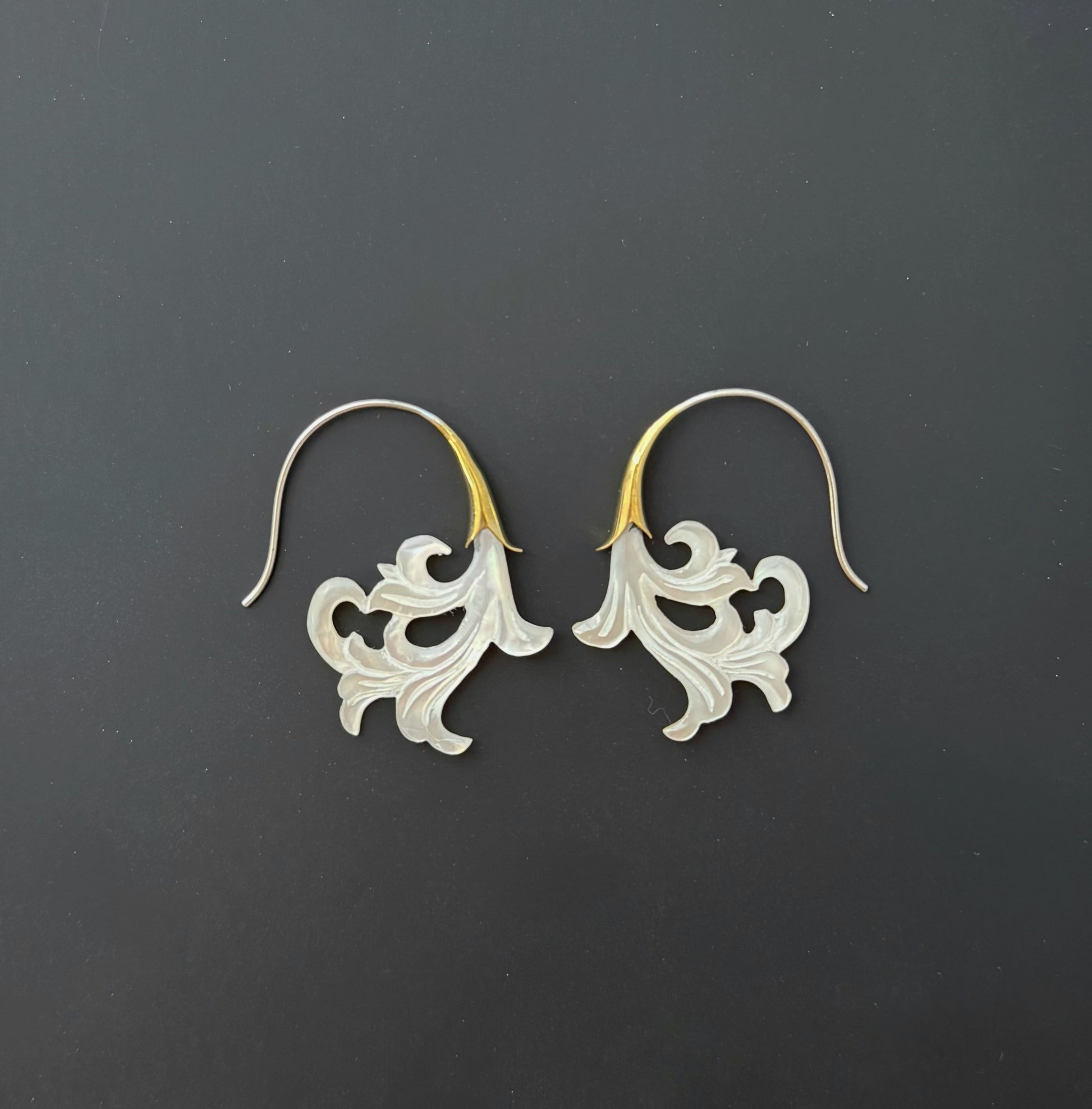 Delicate and organic, the Pearl Bloom earrings are inspired by nature in full expression. Each floral form is carved from genuine mother of pearl and set in sterling silver, reflecting light softly with every movement. A graceful statement for those who love subtle elegance and artisanal craftsmanship,
